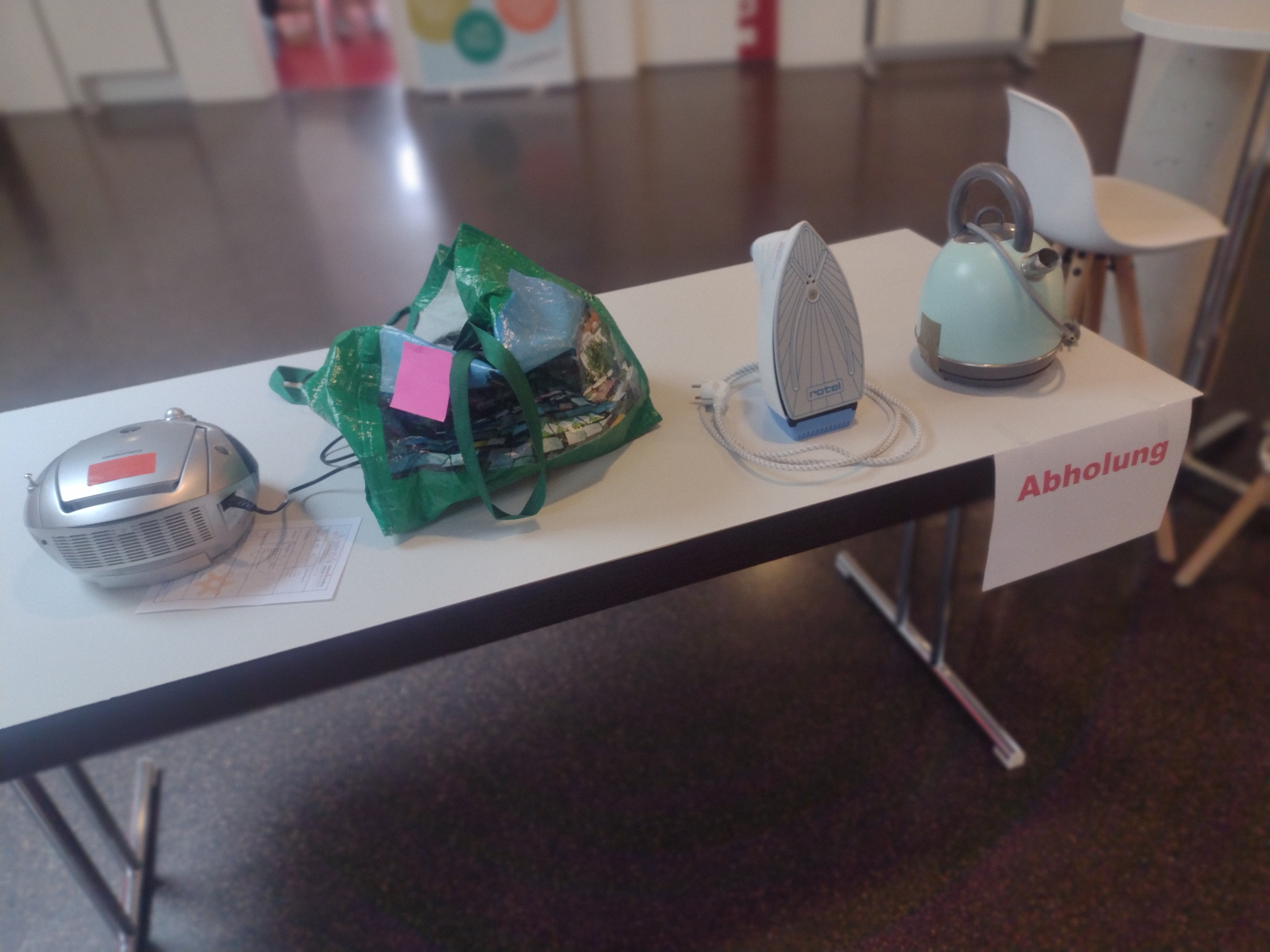 Der ANNAHME Tisch war gut gefüllt, die Reparateure hatten alle Hände voll zu tun, und der Tisch zur ABHOLUNG – wir durften wegen Corona nicht zusammen mit den Besuchern die Geräte reparieren – war auch immer gut bestückt.